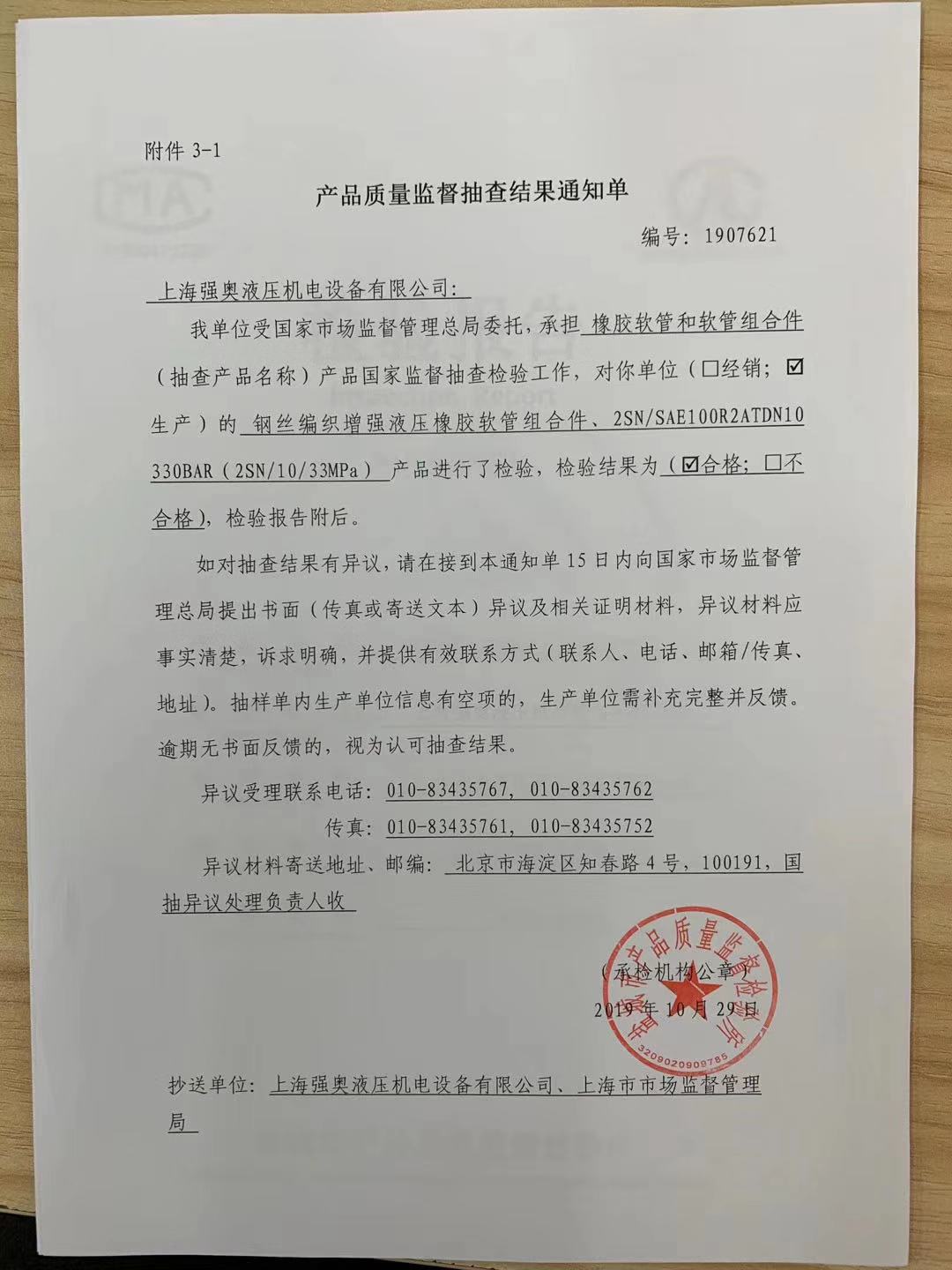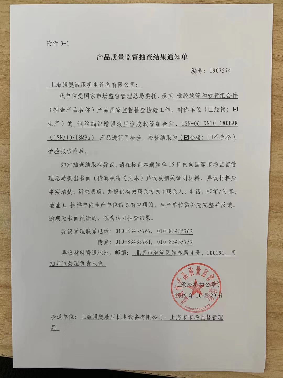 熱烈祝賀 上海強奧液壓機電設備有限公司 于2019年10月29日順利通過 國家市場監(jiān)督管理局 對我司2個批次的產(chǎn)品質量監(jiān)督抽查!